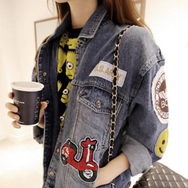 韩国新款米奇字母徽章贴布宽松牛仔外套