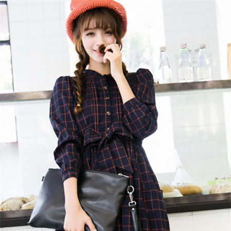 2014秋季新款 英伦风格子系带收腰单排扣长袖连衣裙